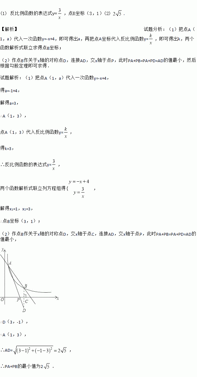 (1) 反比例函数的表达式y=,点B坐标(3,1)(2) . 【解析】试题分析:(1)把点A(1,a)代入一次函数y=-x+4,即可得出a,再把点A坐标代入反比例函数y=,即可得出k,两个函数解析式联立求得点B坐标; (2)作点B作关于x轴的对称点D,连接AD,交x轴于点P,此时PA+PB=PA+PD=AD的值最小,然后根据勾股定理即可求得. 试题解析:(1)把点A(1,a)代入...