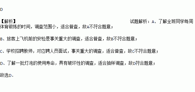 C. 学校招聘教师,对应聘人员面试 D. 了解一批灯泡的使用寿命