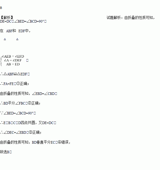 如图,将长方形ABCD沿直线BD折叠,使点C落在点E处,BE交AD于F,连接CE,下列结论①FA=FE ②BD平分∠FBC ③∠DEC=∠EBD ④EC垂直平分BD,正确的是( )