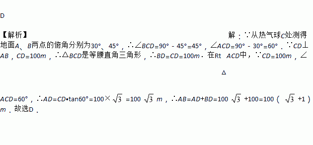 如图,从热气球C处测得地面A、B两点的俯角分别为30°、45°,如果此时热气球C处的