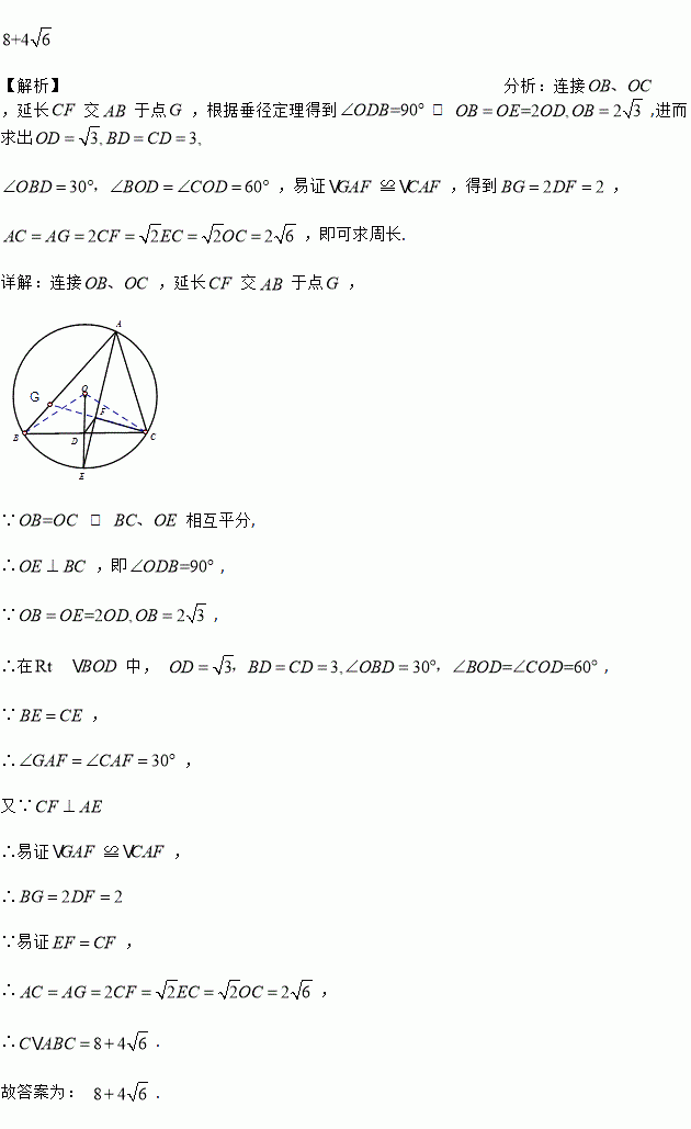 如图,点O为的外接圆圆心,点为圆上一点, 互相平分, 于,链接,若, ,则的周长为 .