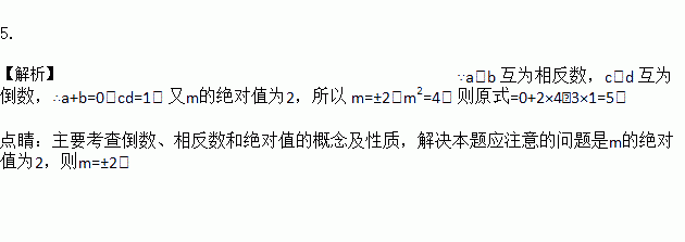 若 a 、 b 互 为 相 反 数 , c 、 d 互 为 倒 数 , m 的 绝 对 值 为 2 , 则 的值是____________.