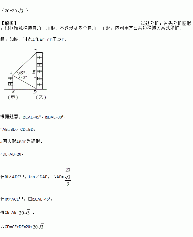 如图,甲楼AB的高度为20米,自甲楼楼顶A处,测得乙楼顶端C处的仰角为45°,测得乙楼底部D处的俯角为30°,则乙楼CD的高度是_____ 米.