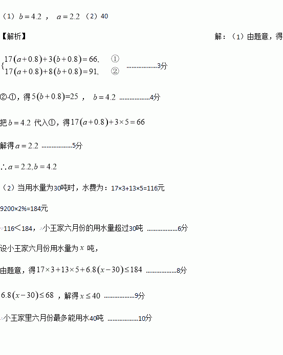 (2)随着夏天的到来,用水量将增加。为了节省开支。小王计划把6月份的水费控制在不超过家庭月收入的2%,若小王家的月收入为9200元,则小王家6月份最多能用水多少吨?