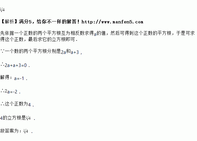 若2a和a + 3是一个数的两个不同的平方根,则这个数的立方根是_______________________.