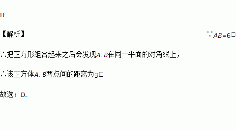 如图,在正方体的平面展开图中A、B两点间的距离为6,折成正方体后A、B两点是正方体的顶点,则这两个顶点的距离是( )