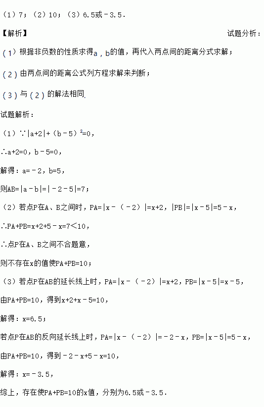 (1)7;(2)10;(3)6.5或﹣3.5. 【解析】试题分析: (1)根据非负数的性质求得a,b的值,再代入两点间的距离分式求解; (2)由两点间的距离公式列方程求解来判断; (3)与(2)的解法相同. 试题解析: (1)∵|a+2|+(b﹣5)2=0, ∴a+2=0,b﹣5=0, 解得:a=﹣2,b=5, 则AB=|a﹣b|=|﹣2﹣5|...