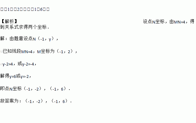 (﹣1,﹣2),(﹣1,6). 【解析】设点N坐标,由MN=4,得到关系式求得两个坐标. 【解析】 由题意设点N(-1,y), ∵已知线段MN=4,M坐标为(-1,2), ∴y-2=4,或y-2=-4, 解得y=6或y=-2, 即点N坐标(-1,-2),(-1,6). 故答案为:(-1,-2),(-1,6).