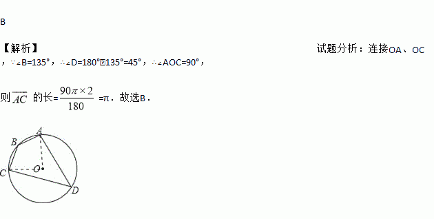 如图,四边形ABCD是⊙O的内接四边形,⊙O的半径为2,∠B=135°,则 的长( )