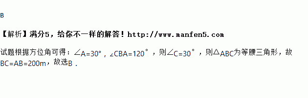 如图,杭州市郊外一景区内有一条笔直的公路a经过两个景点A,B,景区管委会又开发了风景优美的景点C,经测量景点C位于景点A的北偏东60°方向,又位于景点B的北偏东30°方向,且景点A、B相距200m,则景点B、C相距的路程为( )