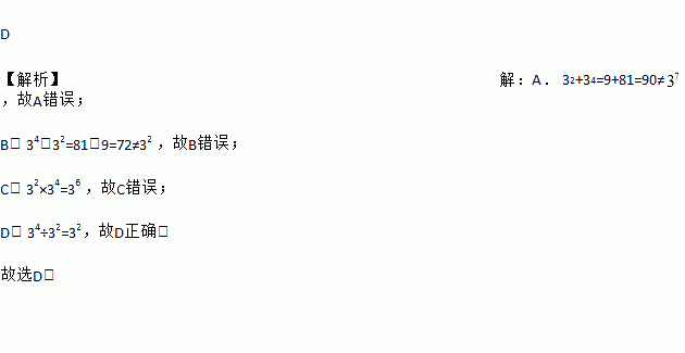 A. 32+34=37 B. 34-32=32 C. 32×34=38 D. 34÷32=32
