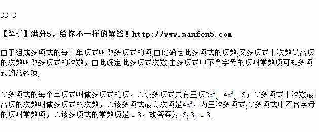多项式2x2+4x3-3是_____次_____项式,常数项是________.