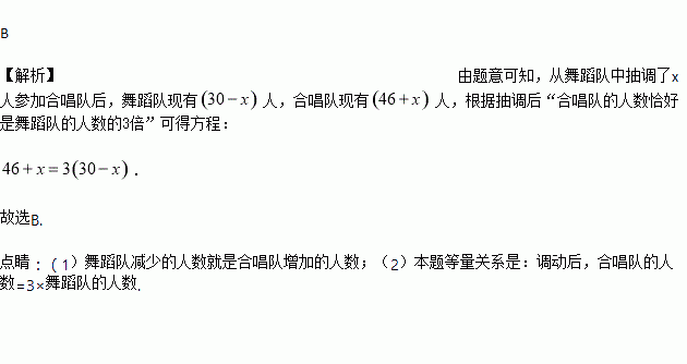 为了参加全校文艺演出,某年级组建了46人的合唱队和30人的舞蹈队,现根据演出需要,从舞蹈队中抽调了部分同学参加合唱队,使合唱队的人数恰好是舞蹈队的人数的3倍.设从舞蹈队中抽调了x人参加合唱队,可得正确的方程是( )