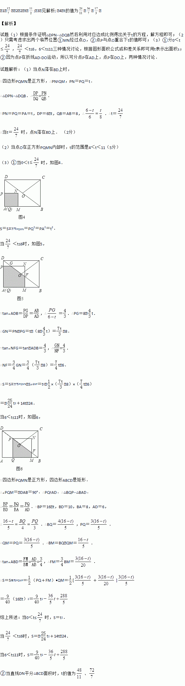 如图,在矩形ABCD中,AB=4,BC=3,点O为对角线BD的中点,点P从点A出发,沿折线AD﹣DO﹣OC以每秒1个单位长度的速度向终点C运动,当点P与点A不重合时,过点P作PQ⊥AB于点Q,以PQ为边向右作正方形PQMN,设正方形PQMN与△ABD重叠部分图形的面积为S(平方单位),点P运动的时间为t(秒).