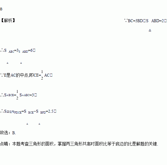 如图,△ABC中,点D、E分别在BC、AC边上,E是AC的中点,BC=3BD,BE与AD相交于F,S△ABD=2,S△BFD=0.5,则四边形FDCE的面积为( )