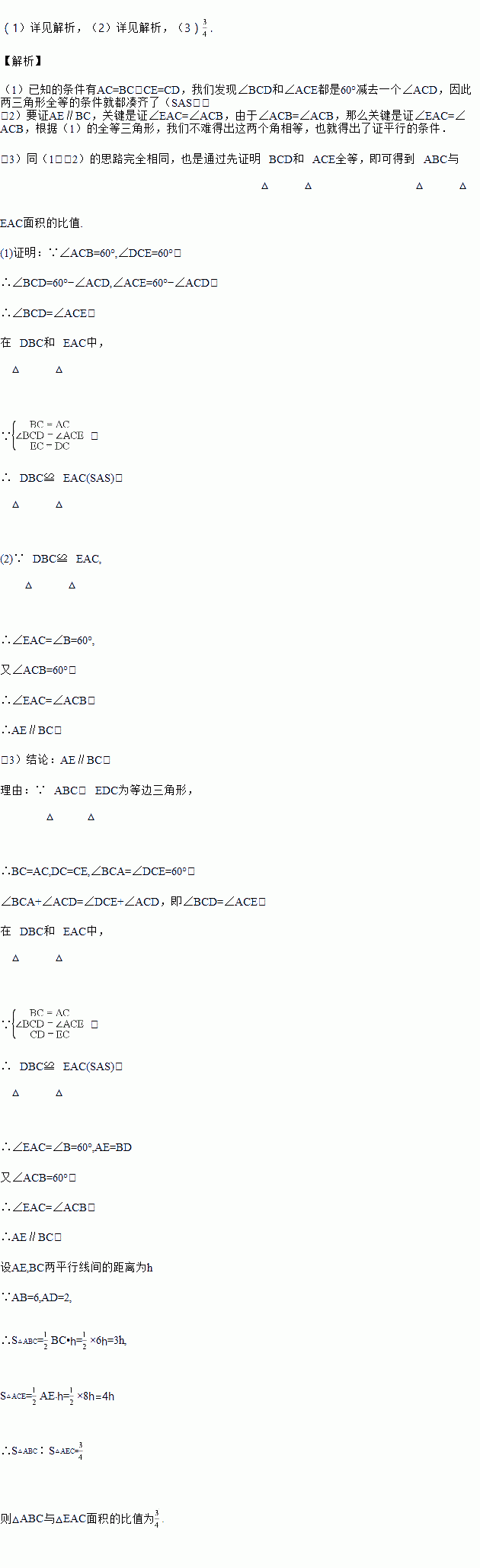 (如图1,等边△ABC中,D是AB边上的点,以CD为一边,向上作等边△EDC,连接AE.