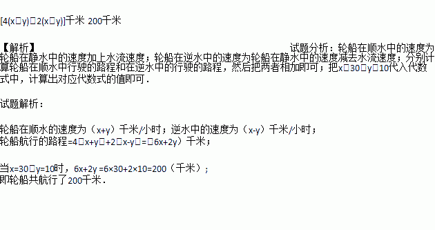 某旅游团乘轮船旅游,轮船顺流航行4小时,逆流航行2小时,已知轮船在静水中航行的速度为x千米/时,水流速度为y千米/时,则轮船一共航行了多少千米?当x=30,y=10时,轮船一共航行了多少千米?