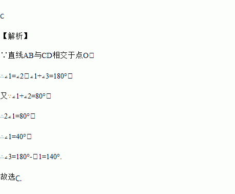 如图,直线AB与CD相交于点O,若∠1+∠2=80°,则∠3等于( )