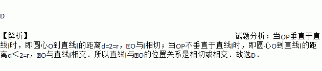 查看答案已知⊙O的半径为2,直线l上有一点P满足PO=2,则直线l与⊙O的位置关系是( )