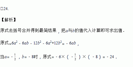 先化简,再求值:(6a2-6ab-12b2)-3(2a2-4b2),其中a=-,b=-8.