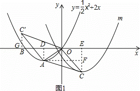 ,由此可得抛物线m的解析式过点C作CE⊥x轴,垂足为E;过点A作AF⊥CE,垂足为F,与y轴交与点H,根据勾股定理可求出OC的长,同理可得AC的长,OC=AC,由翻折不变性的性质可知,OC=AC=OC′=AC′,由此即可得出结论;