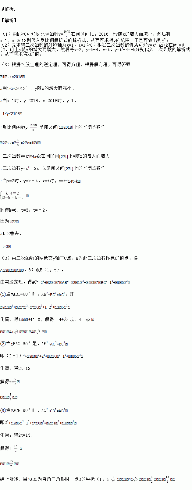 (2)如果已知二次函数y=x2﹣4x+k是闭区间[2,t]上的“闭函数”,求k和t的值;