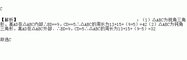 △ABC中,边AB=15,AC=13,高AD=12,则△ABC的周长是
