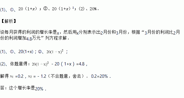 某公司今年销售一种产品,1月份获得利润20万元.由于产品畅销.利润逐月增加,3月份的利润比2月份的利润增加4.8万元,假设该产品利润每月的增长率相同,求这个增长率.设这个增长率为x