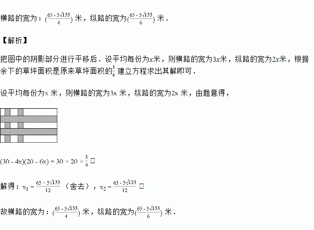 如图,某中学为方便师生活动,准备在长、宽的矩形草坪上修筑两横两纵四条小路,横、纵路的宽度之比为,若要使余下的草坪面积是原来草坪面积的,则路宽分别为多少?