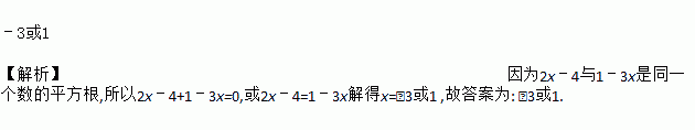 ﹣3或1 【解析】因为2x﹣4与1﹣3x是同一个数的平方根,所以2x﹣4+1﹣3x=0,或2x﹣4=1﹣3x解得x=﹣3或1 ,故答案为: ﹣3或1.