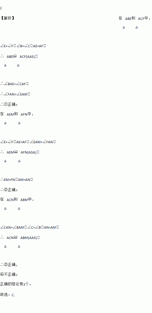 C ¡¾½âÎö¡¿ÔÚ¡÷ABEºÍ¡÷ACFÖУ¬ ¡ÏE=¡ÏF£¬¡ÏB=¡ÏC£¬AE=AF£¬ ¡à¡÷ABE¡Õ¡÷ACF(AAS)£¬ ¡à¡ÏBAE=¡ÏCAF£¬ ¡à¡ÏFAN=¡ÏEAM£¬ ¡à¢ÙÕýÈ·£» ÔÚ¡÷AEMºÍ¡÷AFNÖУ¬ ¡ÏE=¡ÏF£¬AE=AF£¬¡ÏEAM=¡ÏFAN£¬ ¡à¡÷AEM¡Õ¡÷AFN(ASA)£¬ ¡àEM=FN£¬AM=AN£¬ ¡à¢ÚÕýÈ·£» ÔÚ¡÷ACNºÍ...