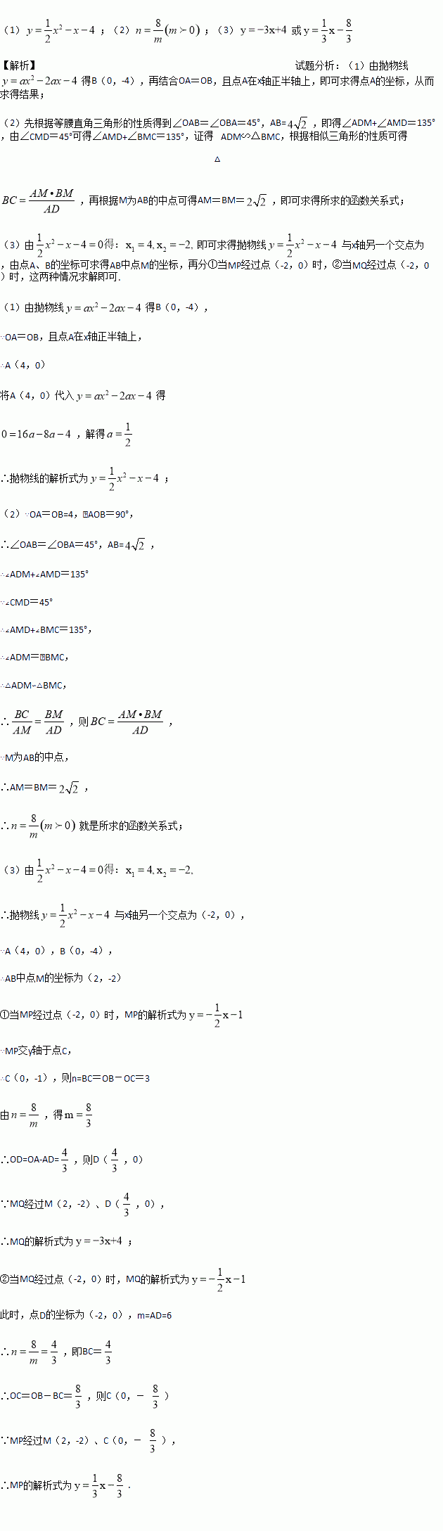 (2)若点M为AB的中点,且∠PMQ=45°,∠PMQ在AB的同侧,以点M为旋转中心将∠PMQ旋转,MP交y轴于点C,MQ交x轴于点D.设AD=m(m>0),BC=n,求n与m之间的函数关系式;