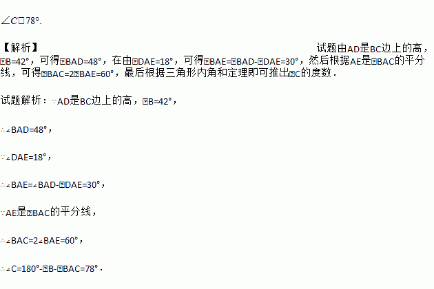 如图,在△ABC中,AD是BC边上的高,AE是∠BAC的平分线,∠B=42°,∠DAE=18°,求∠C的度数.