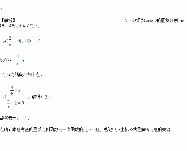 如图,在平面直角坐标系中,一次函数y = kx - 2的图象分别与x轴、y轴交于A、B两点,与函数的图象交于点C.若点A为线段BC的中点,则k的值为_____________ .