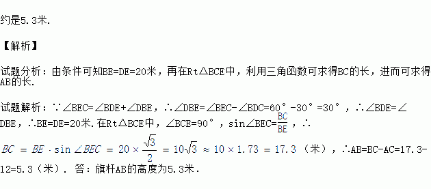 如图,某建筑物AC顶部有一旗杆AB,且点A,B,C在同一条直线上,小明在地面D处观测旗杆顶端B的仰角为30°,然后他正对建筑物的方向前进了20米到达地面的E处,又测得旗杆顶端B的仰角为60°,已知建筑物的高度AC=12m,求旗杆AB的高度(结果精确到0.1米).参考数据: