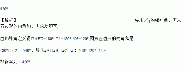 如图,∠1是五边形ABCDE的一个外角.若∠1=60°,则∠A+∠B+∠C+∠D的度数为_________.
