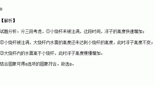 一个大烧杯中装有一个小烧杯,在小烧杯中放入一个浮子(质量非常轻的空心小圆球)后再往小烧杯中注水,水流的速度恒定不变,小烧杯被注满后水溢出到大烧杯中,浮子始终保持在容器的正中间.用x表示注水时间,用y表示浮子的高度,则用来表示y与x之间关系的选项是