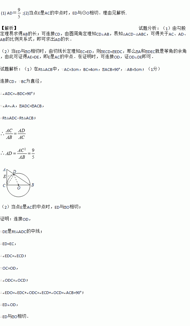 (2)点E是线段AC上的一点,试问当点E在什么位置时,直线ED与⊙O相切?请说明理由.
