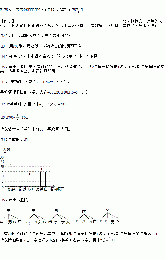 £¨5£©ÔÚ±»µ÷²éµÄѧÉúÖУ¬Ï²»¶ÀºÇòµÄÓÐ2ÃûŮͬѧ£¬ÆäÓàΪÄÐͬѧ£®ÏÖÒª´ÓÖÐËæ»ú³éÈ¡2Ãûͬѧ´ú±í°à¼¶²Î¼ÓУÀºÇò¶Ó£¬ÇëÔËÓÃÁбí»òÊ÷״ͼÇó³öËù³éÈ¡µÄ2ÃûͬѧǡºÃÊÇ1ÃûŮͬѧºÍ1ÃûÄÐͬѧµÄ¸ÅÂÊ£®