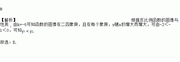 已知点A(﹣2,y1).B(﹣1,y2)在反比例函数y=﹣上,则y1与y2的大小关系是( )