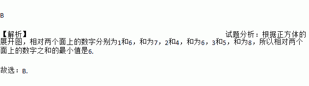 B 【解析】试题分析:根据正方体的展开图,相对两个面上的数字分别为1和6,和为7,2和4,和为6,3和5,和为8,所以相对两个面上的数字之和的最小值是6. 故选:B.