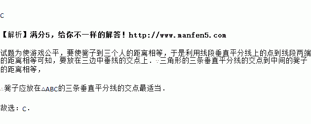 联欢会上,A、B、C三名选手站在一个三角形三个顶点上玩抢凳子游戏,在他们中间放个木凳,谁先抢到凳子就获胜,为使游戏公平,凳子应放的最适当位置是△ABC的