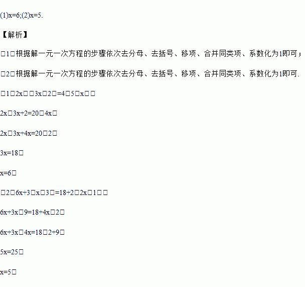 (1)x﹣(3x﹣2)=2(5﹣x)