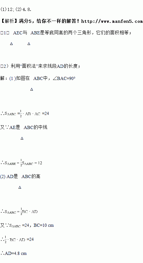 如图,已知AD、AE分别是△ABC的高和中线,AB=6 cm,AC=8 cm,BC=10 cm,∠BAC=90°.试求: (1)△ABE的面积;(2)AD的长度;
