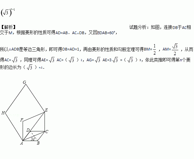如图,边长为1的菱形ABCD中,∠DAB=60°;连结对角线AC,以AC为边作第二个菱形ACEF,使∠FAC=60°;连结AE,再以AE为边作第三个菱形AEGH,使∠HAE=60°;…,按此规律所作的第