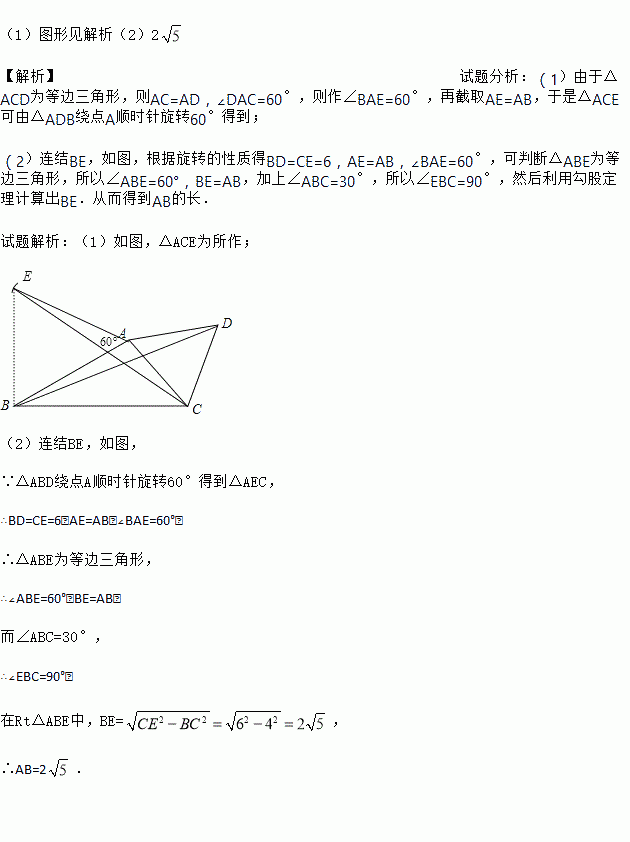 (1)以点A为中心,把△ADB顺时针旋转60°,画出旋转后的图形(保留作图痕迹);