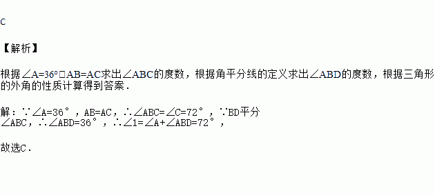 如图,等腰三角形ABC中,AB=AC,BD平分∠ABC,∠A=36°,则∠1的度数为( )