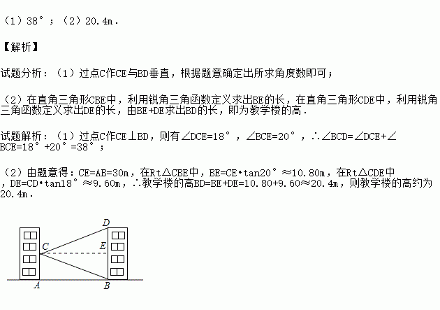 如图,学校的实验楼对面是一幢教学楼,小敏在实验楼的窗口C测得教学楼顶部D的仰角为18°,教学楼底部B的俯角为20°,量得实验楼与教学楼之间的距离AB=30m.