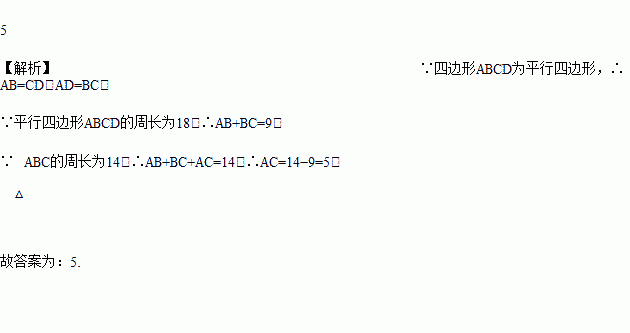 平行四边形ABCD的周长是18,三角形ABC的周长是14,则对角线AC的长是_____________。