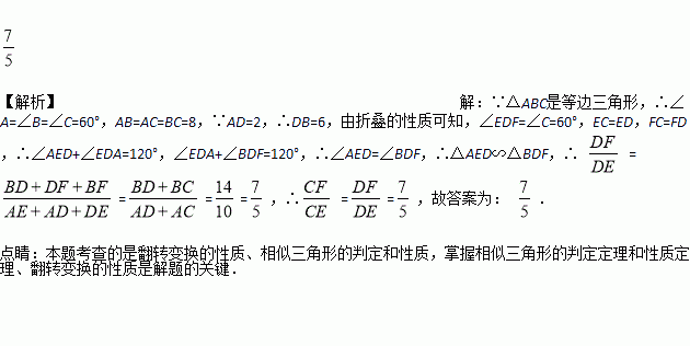如图,将等边三角形ABC折叠,使得点C落在边AB上的点D处,折痕为EF,点E,F分别在AC和BC上.若AC=8,AD=2,则=_______________.